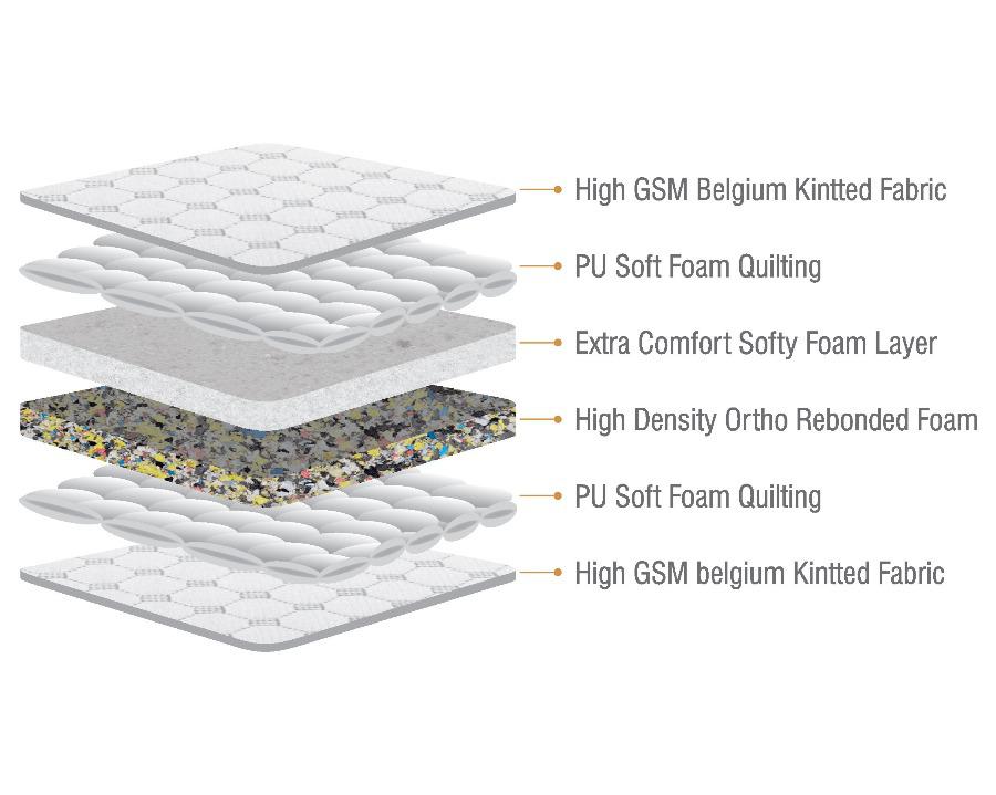 The Cloud mattress has been meticulously constructed with high-density Ortho Bonded foam that uniformly disperses body weight to support your body. The Ortho Bonded foam is covered with PU soft foam on the top, which provides you with luxurious comfort. Additionally, the Cloud mattress features a layer of Extra Soft Foam, enhancing the mattress's sturdiness. Dr. Orthopluse’s Cloud comes with an extra PU soft foam quilting as Eurotop and is finished with high GSM Belgium knitted fabric.