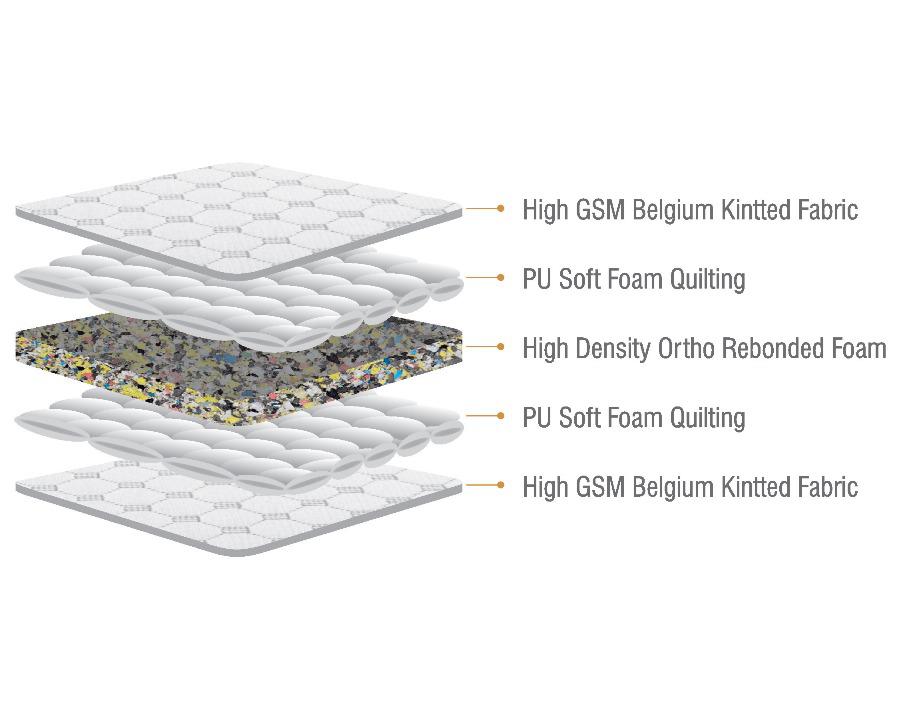 The Ortho Luxury mattress provides a premium iteration of an orthopedic mattress, featuring a blend of high-density Ortho-Bonded foam and high-density Ortho Memory Rebonded Foam to achieve an optimal balance between support and comfort. Compared to the Ortho Spine mattress, the Ortho Luxury mattress is designed with a softer feel to provide more comfort. Moreover, it is covered with revolutionary Anti Skid Fabric and is adorned with PU Soft Foam quilting, culminating in a comfortable sleep.