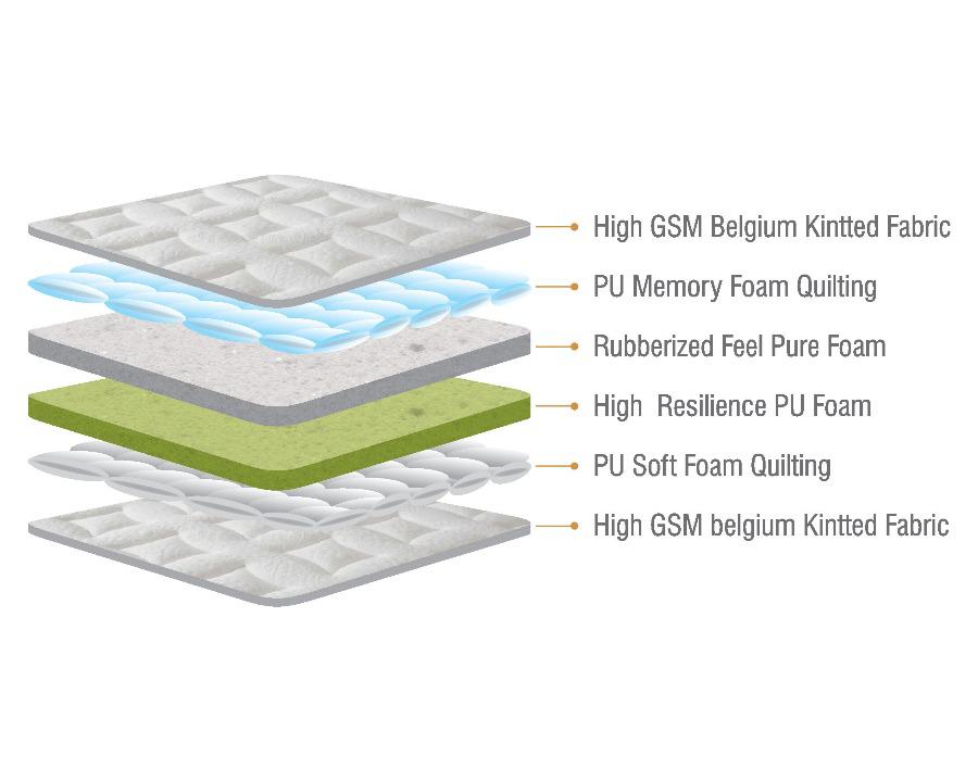 The Cozy Mattress is designed with a luxurious self-quilted high GSM fabric that adds plush softness and durability, while the memory quilting beneath gently conforms to your body, relieving pressure at critical points like the neck, shoulders, and back. At its core, a high-resilience (HR) foam support layer ensures long-term orthopedic stability, reducing motion transfer and promoting healthy spine alignment. On top, a comfort layer made of PU latex foam offers a gentle bounce and natural breathability — making the mattress both cool and responsive through every season. This thoughtful combination delivers the perfect balance of deep support and cloud-like comfort for restful, pain-free sleep every night.